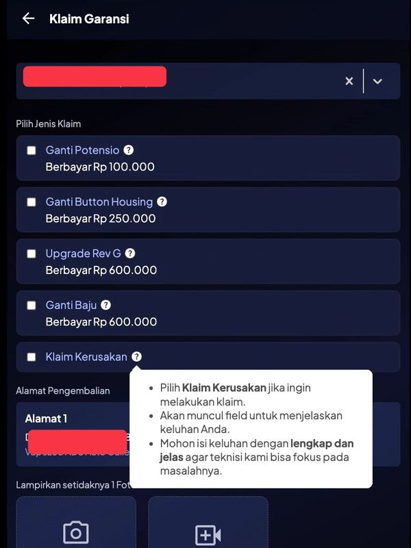 Disini setiap Hexohm ada 3 opsi, Klaim Garansi, Laporan Kehilangan dan Lepas Kepemilikan